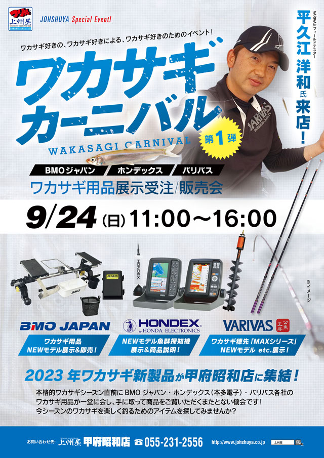 2023年9月24日(日)11:00~16:00、上州屋甲府昭和店にワカサギ新製品が集結!【第1弾】ワカサギカーニバル開催します!第1弾の出展は「BMOJAPAN」、「HONDEX」、「VARIVAS」の3社!