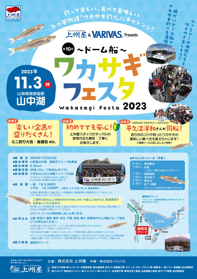 2023年11月3日(金/)、山梨県山中湖にてワカサギ釣り体験イベント上州屋&VARIVAS「ドーム船ワカサギフェスタ2023」を開催します!近年大人気、ドーム船でのワカサギ釣りを手軽に体験頂けるスペシャル企画です!
