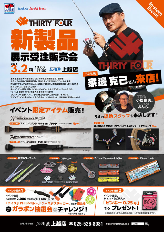 2024年3月2日(日)13:00~17:00、上州屋上越店にて34展示即売会を開催!34代表、家邊克己さんと、地元新潟のアジングに精通するボートアジングインストラクター小松康夫さん、フィールドスタッフおんちさんが来店します!