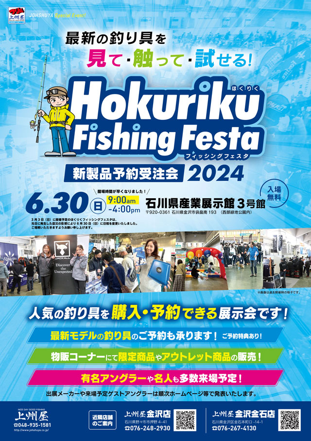 2024年6月30日(日)9:00~16:00、石川県金沢市石川県産業展示館3号館にて人気釣具の購入・予約ができる大展示会「ほくりくフィッシングフェスタ新製品予約受注会2024」を開催します!