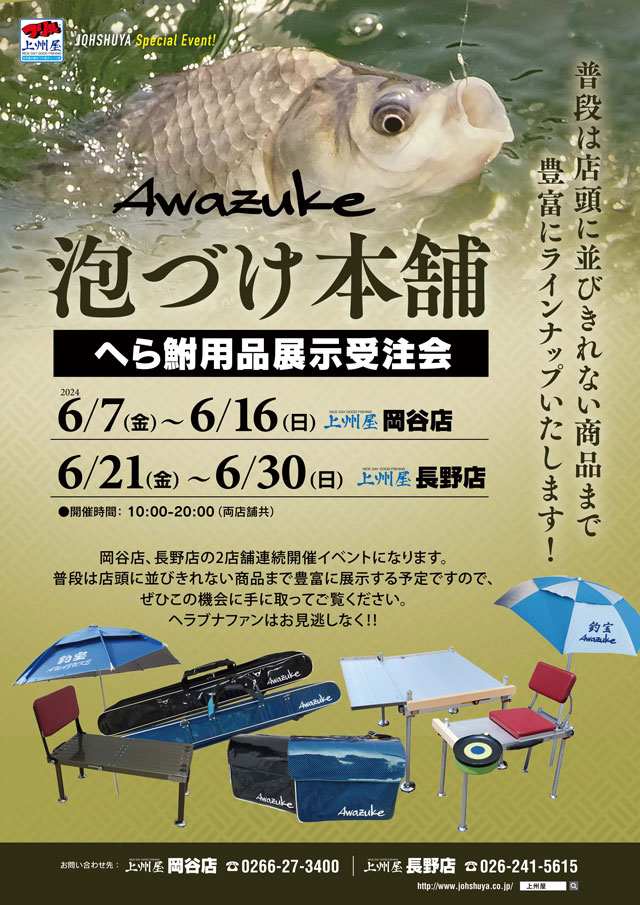 2024年6月7日(金)~16日(の10日間、上州屋岡谷店にて泡づけ本舗“へら鮒用品”の展示受注会を開催します。