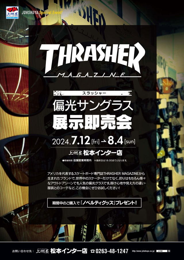 2024年7月12日(金)~8月4日(日)18:00まで、上州屋松本インター店にて釣り人はもちろん、サーファーやスケーターにも人気のブランド、「スラッシャー」の偏光サングラス展示即売会を開催します!