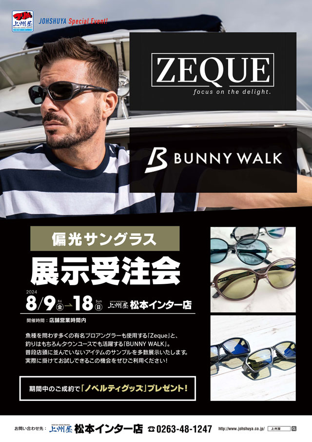 2024年8月9日(金)~18日(日)の10日間、上州屋松本インター店にてプロアングラー御用達の高品質偏光グラスメーカーZequeゼクーと、タウンユースでも活躍するスタイリッシュデザインのBUNNY WALKバニーウォークの偏光サングラス展示受注会を開催します!