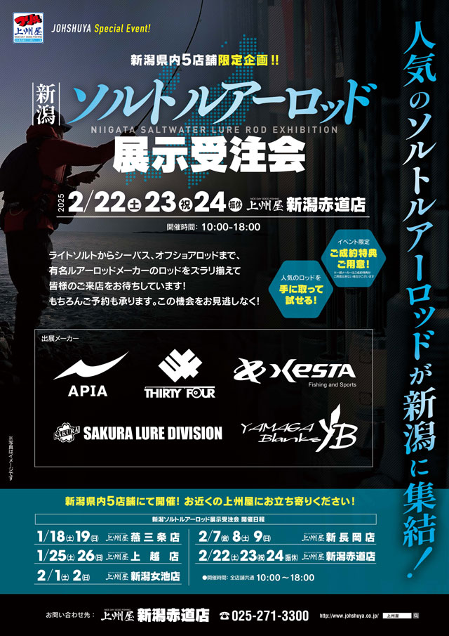 2025年2月22日(土)、23日(日祝)、24日(月/振休)の各日10:00~18:00、上州屋新潟赤道店にて人気メーカー6社のソルトルアーロッド展示受注会を開催します!