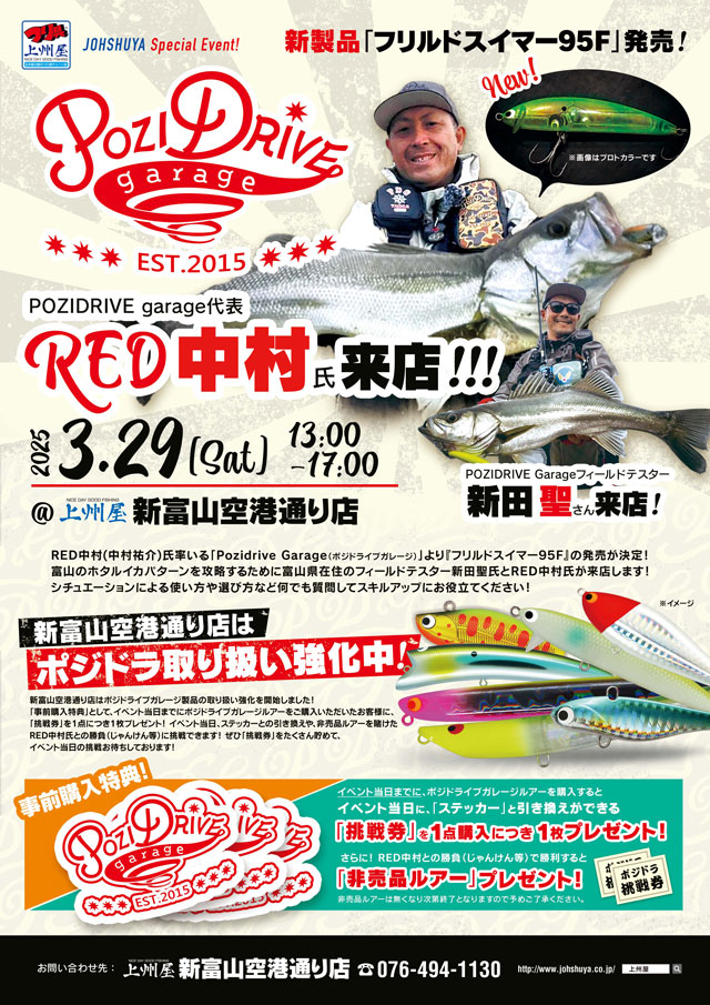 2025年3月29日(土)13:00~17:00、上州屋新富山空港通り店にPozidriveGarage(ポジドライブガレージ)RED中村代表と、新田聖テスターが来店!富山ホタルイカパターン攻略をテーマに、店頭イベントを開催します!