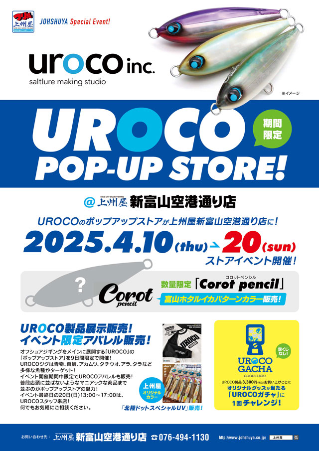 2025年4月10日(木)~20日(日)の11日間、上州屋新富山空港通り店内にUROCOのポップアップストアが期間限定で出店します!