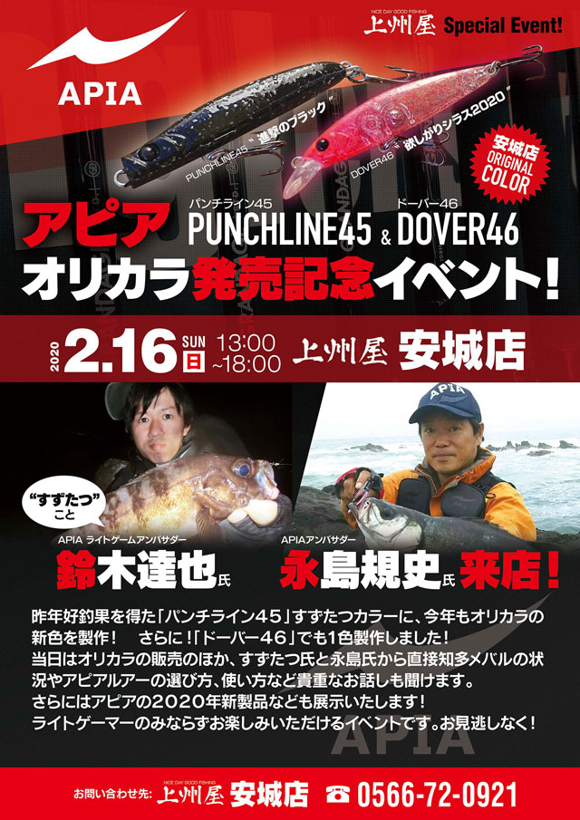 2020年2月16日(13:00~18:00(予定)上州屋安城店に“すずたつ”ことAPIAライトゲームアンバサダー鈴木達也さんと、APIAアンバサダー永島規史さんが来店!パンチライン45&ドーバー46オリカラ発売記念イベントを開催します!