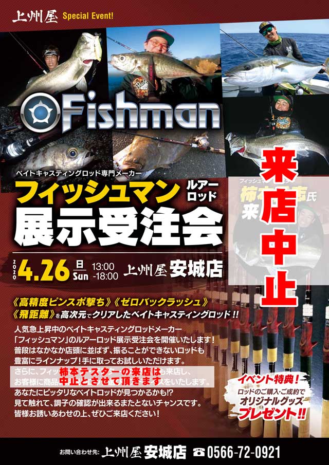 2020年4月26日(日)13:00~18:00、上州屋安城店にて予定しておりましたフィッシュマン展示受注会ですが、新型コロナウイルスの感染拡大防止の観点より、規模を縮小させて頂きます。テスター柿本氏の来店は中止とし、製品展示のみとさせて頂きます。