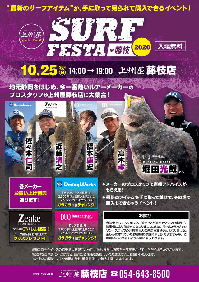 2020年10月25日(日)14:00~19:00予定、上州屋藤枝店にてサーフフェスタin藤枝2020開催!人気ルアーメーカーのプロスタッフが各社新製品、人気製品を展示解説・アドバイスいたします!