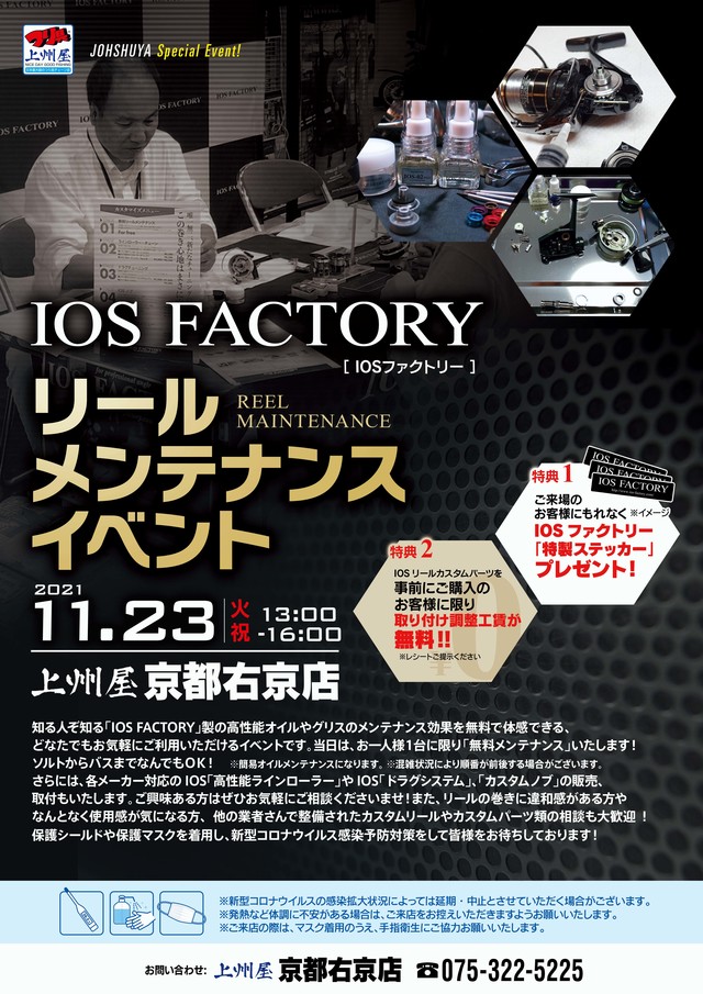 2021年11月23日(火/祝)13:00~16:00(予定)、上州屋京都右京店にてIOSファクトリーによる、店頭リールメンテナンスイベントを開催します!知る人ぞ知るIOSファクトリー製の高性能オイルやグリスのメンテナンス効果をお一人様1台に限り無料で体験いただけます!