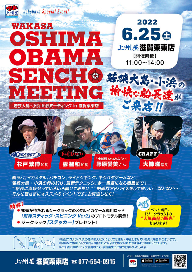 2022年6月25日(土)11:00~14:00、上州屋滋賀栗東店に鯛ラバ・イカメタル・バチコン・ライトジギング・キジハタゲームetc.で人気!若狭大島・小浜の人気船長達がご来店!