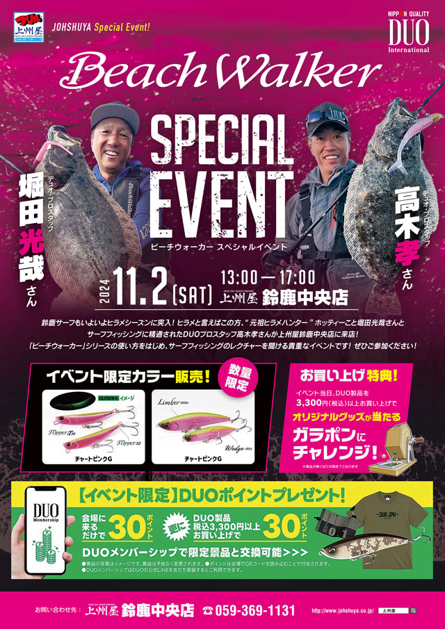 2024年11月2日(13:00~17:00、上州屋鈴鹿中央店にてDUOビーチウォーカー・ストアイベントを開催!いよいよ大ヒラメシーズンに突入する鈴鹿サーフで超実績を誇るDUOビーチウォーカーシリーズ各種限定リミテッドカラーを展示即売します!!