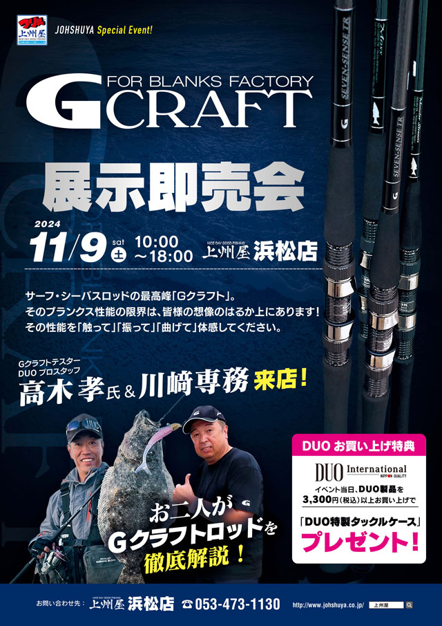 2024年11月9日(土)10:00~18:00、上州屋浜松店にて「Gcraftジークラフト展示販売会」を開催!ジークラフト川崎専務と、ジークラフトテスターを務めるDUOプロスタッフ高木孝さんが来店します!