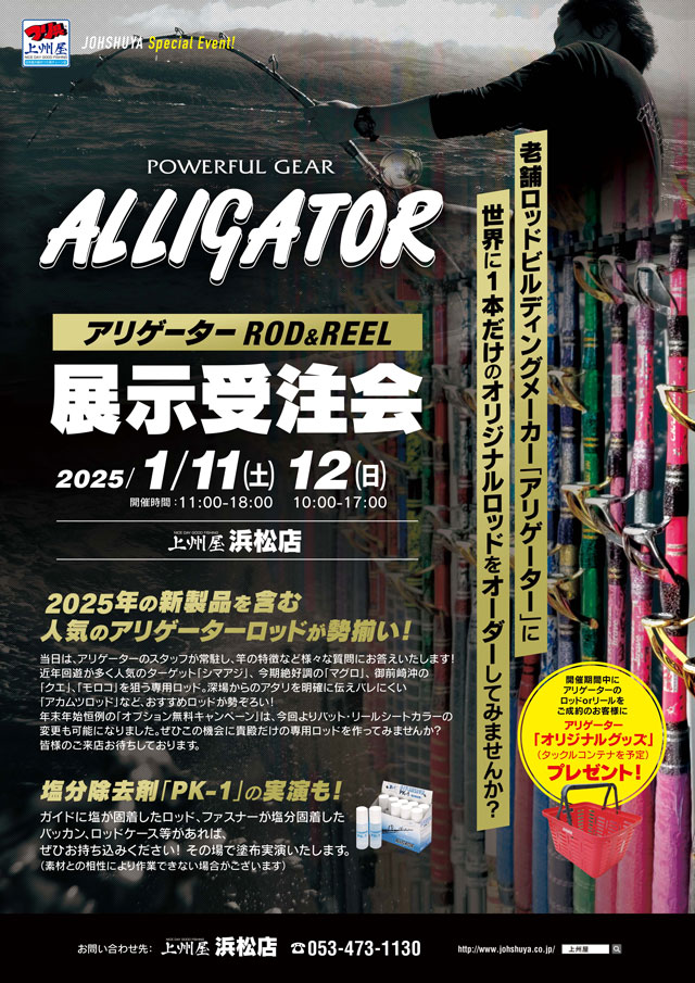 上記2日間、上州屋浜松店にてグラスワンピースロッドの元祖、アリゲーターロッド&リールの展示受注会を開催します!