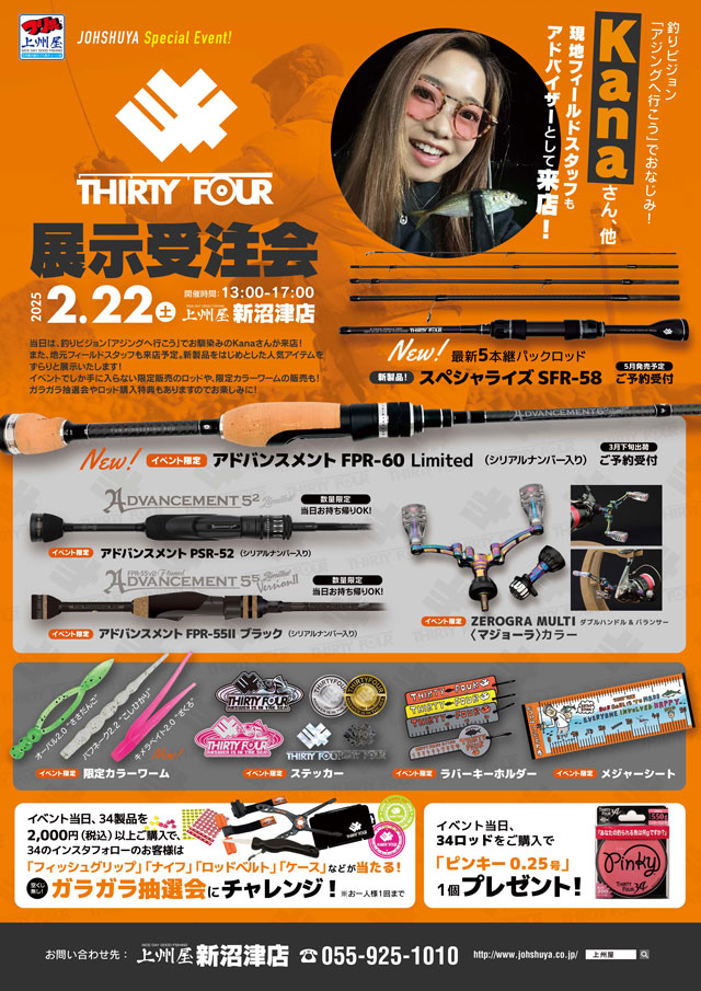2025年2月22日(土)13:00~17:00、上州屋新沼津店にて34展示即売会を開催!当日は釣りビジョン「アジングへ行こう」でお馴染みKanaさん他、地元の釣りに精通する現地フィールドスタッフが来店します!