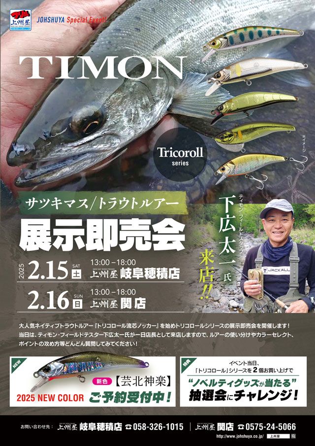 2025年2月16日(日)13:00~18:00、上州屋関店にてTIMONティモン・サツキマス&トラウトルアー展示即売会を開催!当日は下広太一テスターが来店します!