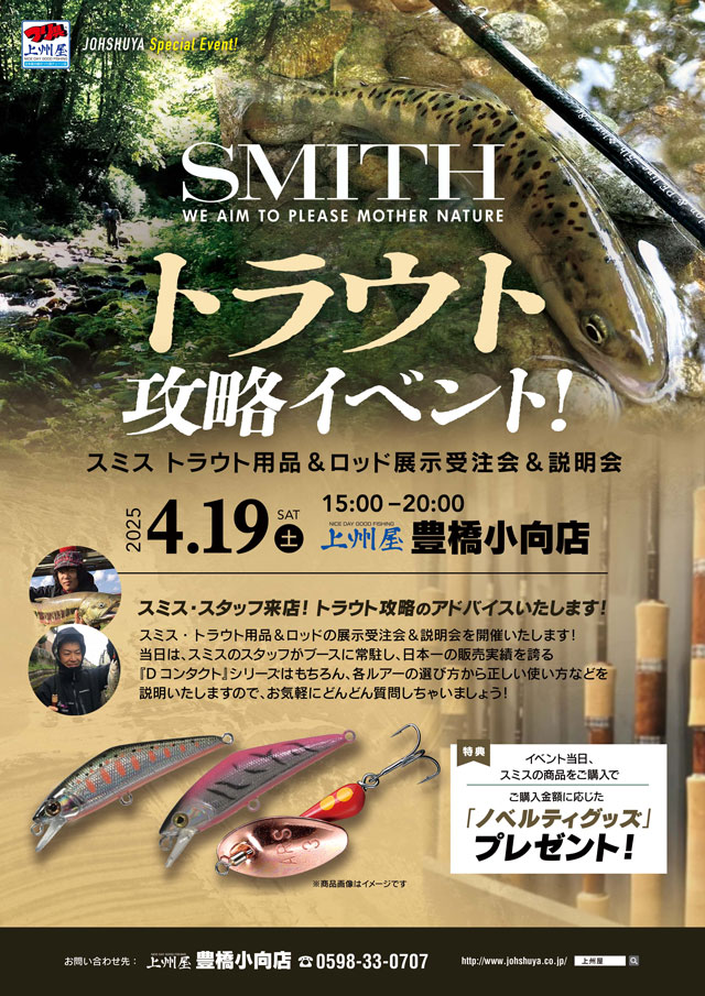 2025年4月19日(土)15:00~20:00、上州屋豊橋小向店にてSMITH(スミス)トラウト攻略、店頭イベントを開催!