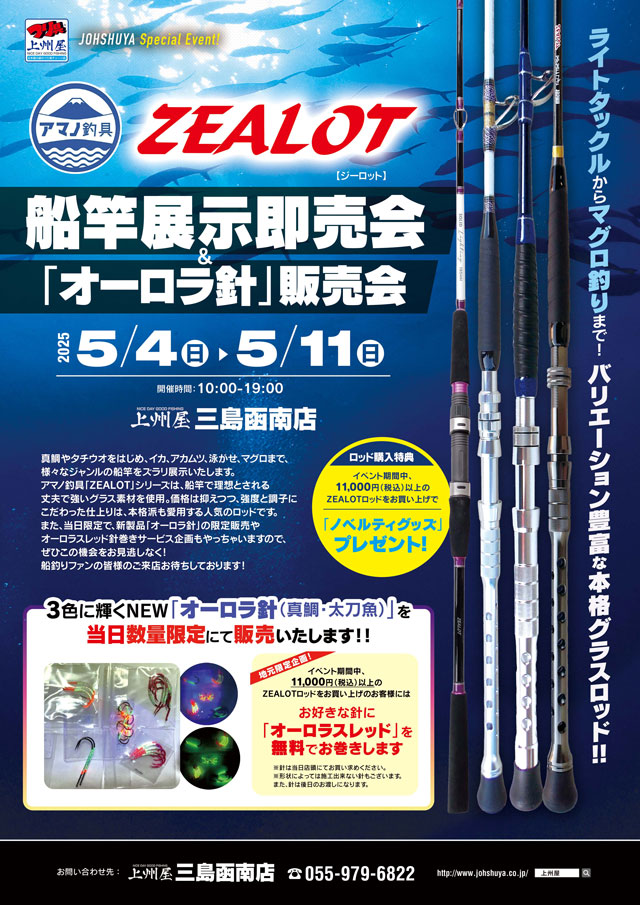 2025年5月4日(日)~11日(日)の8日間、上州屋三島函南店にてアマノ釣り具のZEALOT(ジーロット)船竿展示即売会と、オーロラ針販売会を同時開催します!