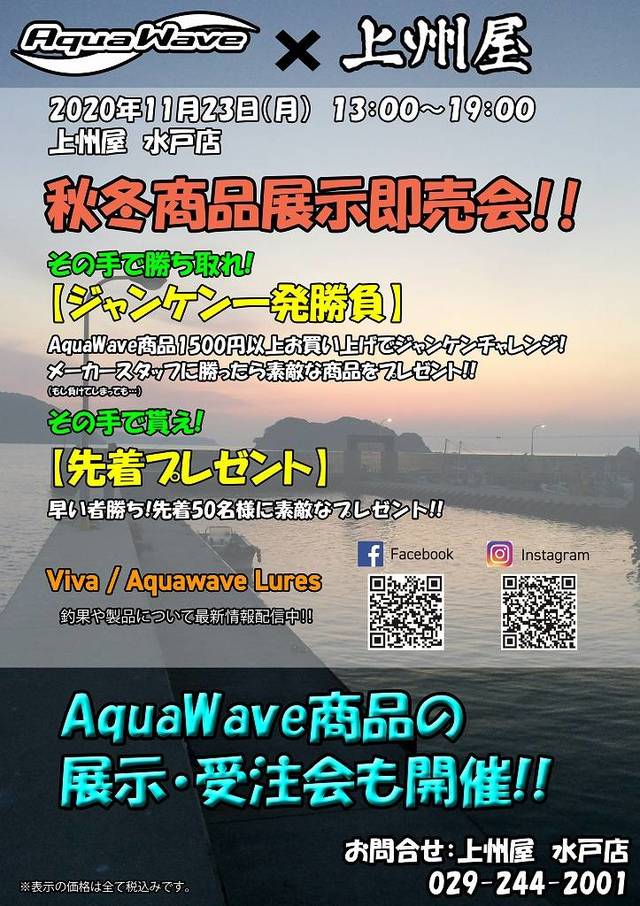 2020年11月23日(月/日)13:00~19:00予定、上州屋水戸店にてコーモランのソルトウォーター専門ルアーブランドAquaWave(アクアウェーブ)製品の秋冬商品展示即売会を開催します!