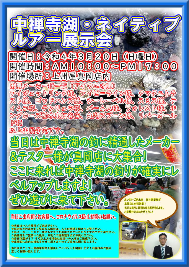 2022年3月20日(10:00~17:00(予定)、上州屋真岡店に中禅寺湖の釣りに精通したメーカーとテスター陣が集結!中禅寺湖・ネイティブルアー展示販売会を開催します!