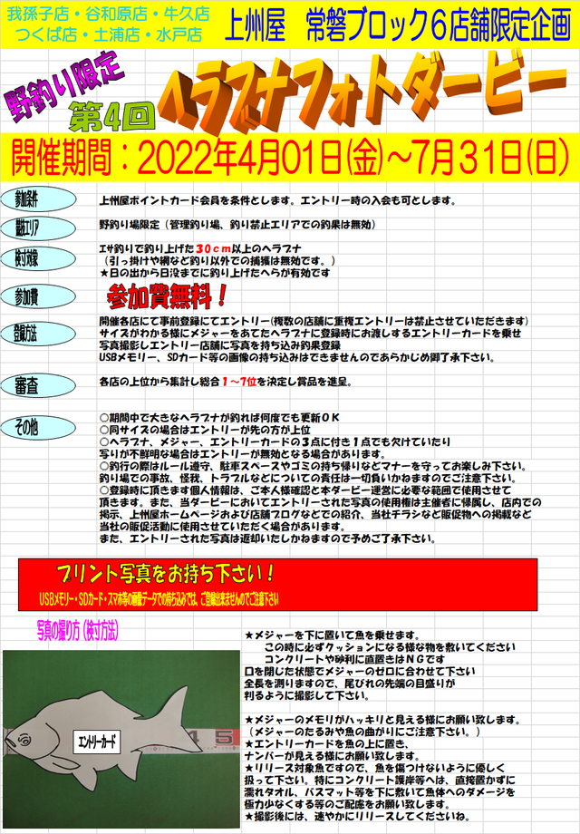 2022年4月1日(金)~7月31日(の4か月間、上州屋我孫子店・谷和原店・牛久店・つくば店・土浦店・水戸店の6店舗にて第4回野釣りへら鮒フォトダービーを開催します!
