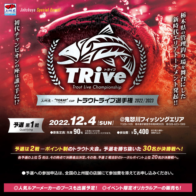 トラウトライブ選手権は、予選2戦&決勝で競う全3戦。今回ご案内の12月4日(日)予選第1戦を皮切りに、翌23年2月に予選第2戦を開催、上位者が3月の決勝大会へ進めます。