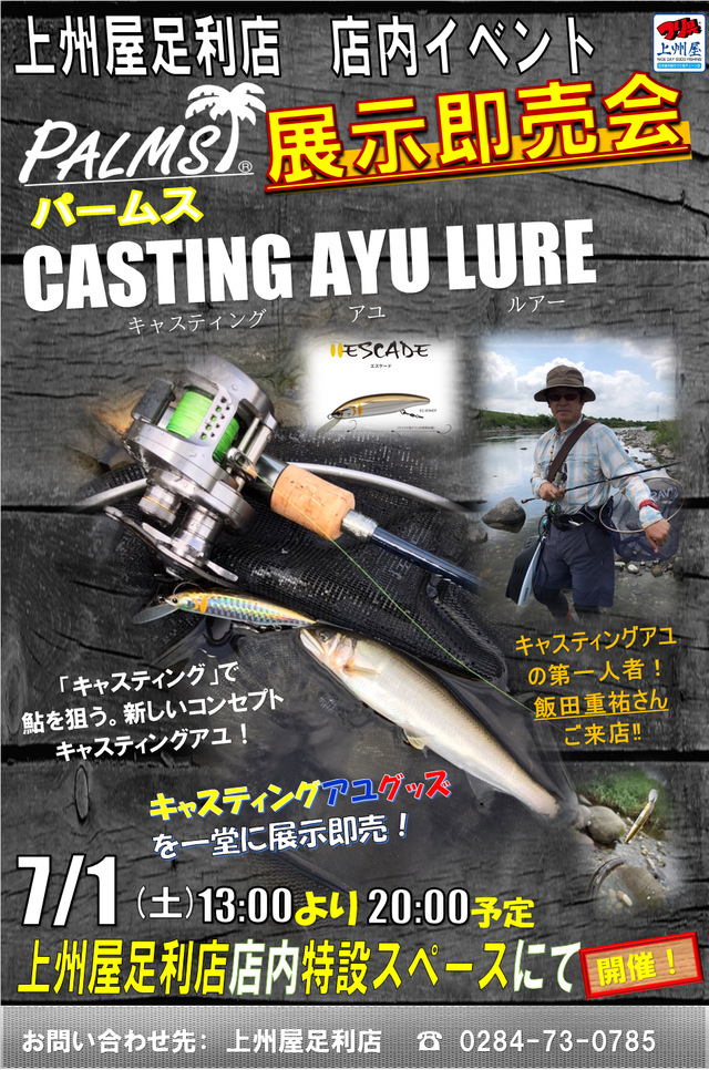 2023年7月1日(土)13:00~20:00、上州屋足利店にてパームス「CASTING AYU LURE」展示即売会を開催します!