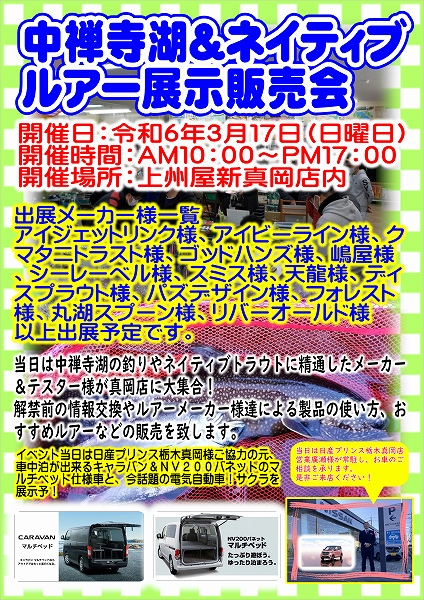 2024年3月17日(10:00~17:00(予定)、上州屋新真岡店に中禅寺湖の釣りに精通したメーカーとテスター陣が集結!中禅寺湖・ネイティブルアー展示販売会を開催します!