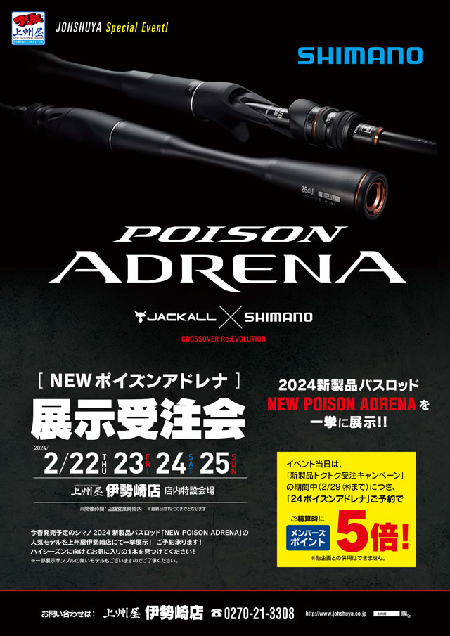2024年2月22日(木)、23日(金)、24日(土)、25日(日)の4日間、上州屋伊勢崎店にてジャッカル×シマノ、2024新製品バスロッド「NEWポイズンアドレナ」の展示受注会を開催します!