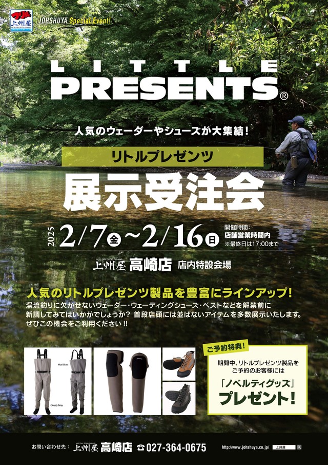2024年2月7日(金)~16日(日)の10日間、上州屋高崎店にてリトルプレゼンツ、ウェーダー・シューズetc.展示受注会を開催します。