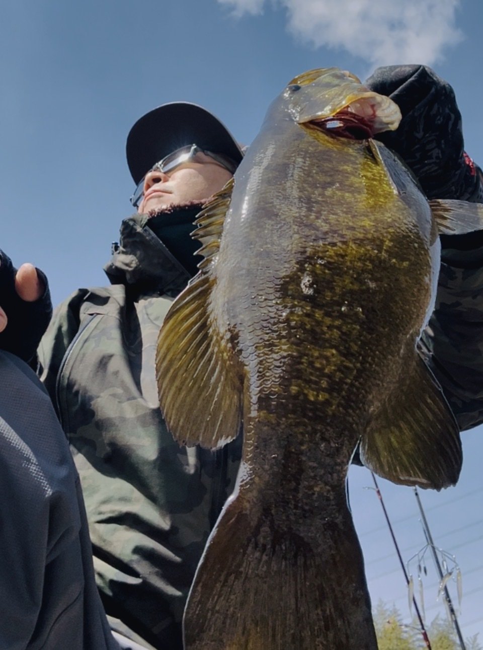 スタッフ美濃崎にとっては二十数年ぶりのバス釣り。天候は曇り時々雨/霰、風も冷たく釣れるのか心配になりながら、ダウンショットワッキーにゲーリーヤマモト「カットテール3.5inch」をセットして打っていきます。岸際を鯉が泳いでいくのを眺めながら打ちかえし続けているとラインが横にスーッと動いていきます。合わせてみると魚がヒット!鯉かな?と思っていましたが寄せてみるとバスの魚体が!四苦八苦しながら47cmの綺麗なバスをキャッチする事ができました!