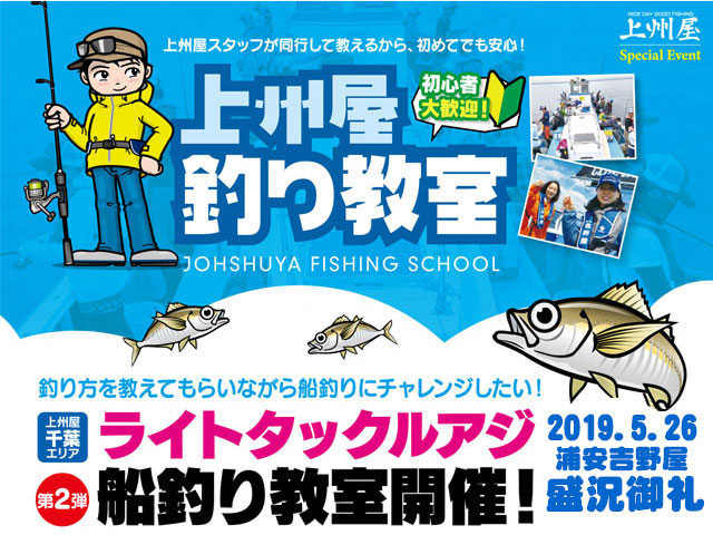 2019年5月26日(日)千葉県浦安市の船宿“吉野屋”にて、上州屋スタッフと行くライトタックルアジ船釣り教室を開催!当日は天候と釣果に恵まれ、多くの参加者の皆様に船からのアジ釣りを楽しんでいただきました!