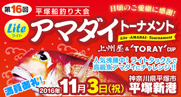 2016年11月3日(祝)、第16回平塚船釣りライトアマダイトーナメント上州屋&TORAYカップが神奈川県平塚新港にて開催されました。