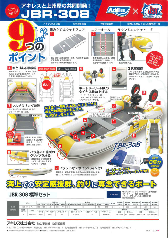 アキレス×上州屋共同開発モデル「JBR-308」ご紹介!釣りに便利な機能満載!船体はアキレスCSM製、5年本体保証、予備検査証付、動力2馬力以下なら船検免許不要!海上での安定感抜群で、釣りに専念できるボートです。