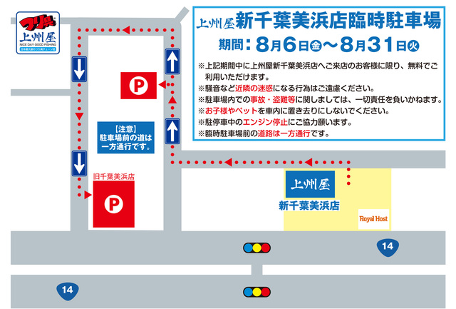上州屋新千葉美浜店のオープン時(8/6~8/31)にご利用いただける臨時駐車場のご案内
