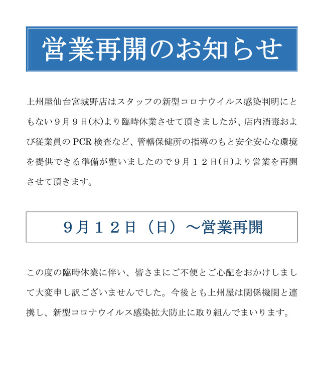 上州屋仙台宮城野店は従業員の新型コロナウイルス感染判明に伴い、臨時休業させて頂いておりましたが、店内消毒および従業員のPCR検査など、管轄保健所の指導のもと安全安心な環境を提供できる準備が整いましたので9月12日(日)より営業再開させて頂きます。