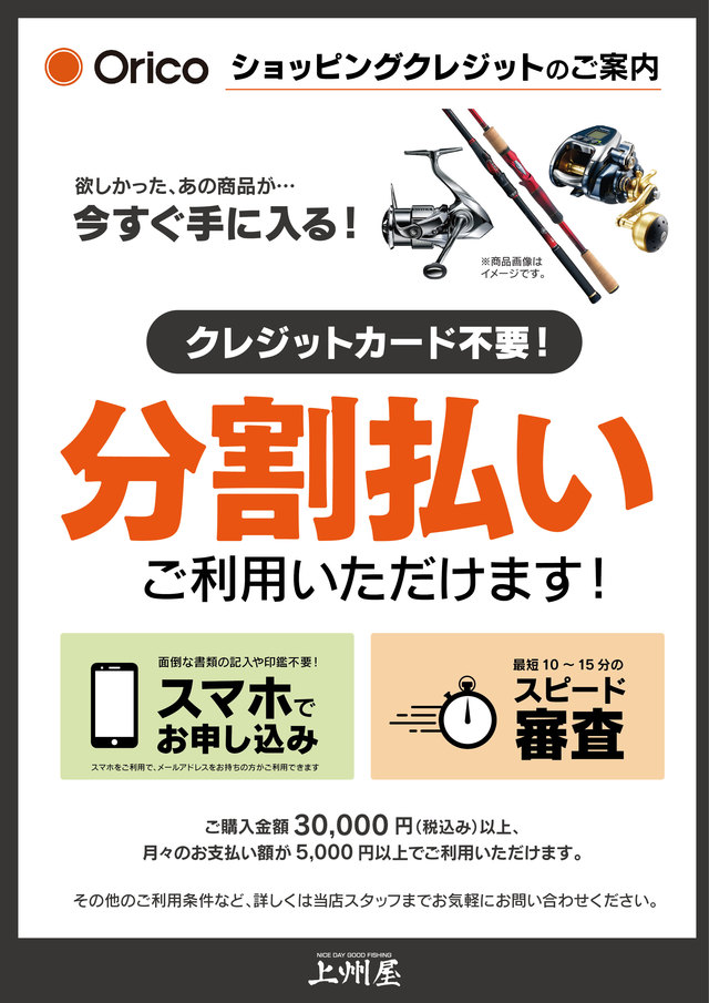 上州屋各店ではクレジットカードがなくても分割払いで商品を購入できるOricoショッピングクレジットをご利用いただけます。