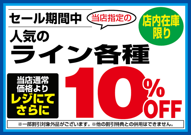 11月13日(木)からセール期間中、当店指定のライン各種が店内在庫限り当店通常価格よりレジにてさらに10%OFF!!