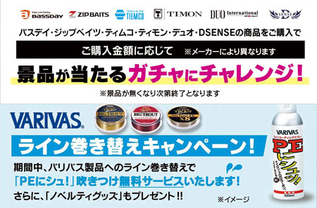 バスデイ・ジップベイツ・ティムコ・ティモン・デュオ・DSENSEの対象商品をご購入で、ご購入金額に応じて景品が当たるガチャにチャレンジ!