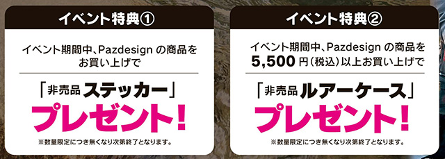 〔特典その2〕イベント期間中、パズデザイン商品を5,500円(税込)以上お買い上げで「非売品ルアーケース」プレゼント!
