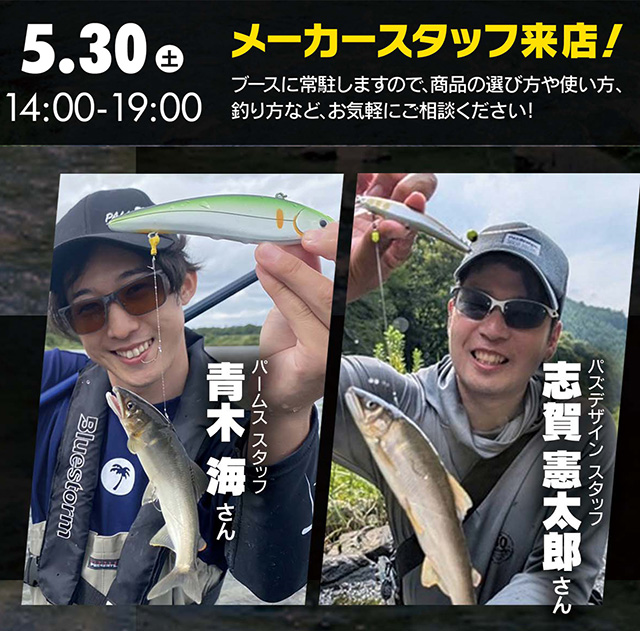 さらに5月30日(土)14:00~19:00の時間帯は、メーカープロスタッフがブースに常駐してくれます!その道のプロをお招きし、根掘り葉掘り質問攻めに!鮎ルアーを始めてみたい方も是非ご来店ください!