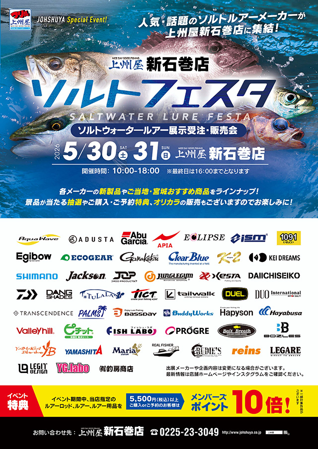 今年も開催!上州屋新石巻店ソルトフェスタ2026年も店頭にソルトルアーの人気メーカーが多数します!