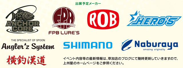 出展予定メーカーは、ロブルアー・アングラーズシステム・なぶら家・横釣漢道・アンカーコア・FPBルアーズ・HERO's・シマノ!