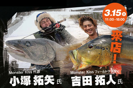 開催初日となる3月15日(日)11:00~18:00の時間帯は、数多の海を渡り歩く怪魚ハンター、小塚拓矢さん(モンスターキス代表)、吉田拓人さん(モンスターキスフィールドテスター)のお2人が店頭アドバイザーとして来店!