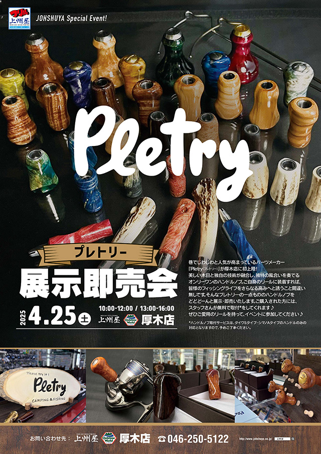 2026年4月25日(10:00~12:00/13:00~16:00午前・午後二部制にて、上州屋アウトドアワールド厚木店にてPletry(プレトリー)展示即売を開催します!