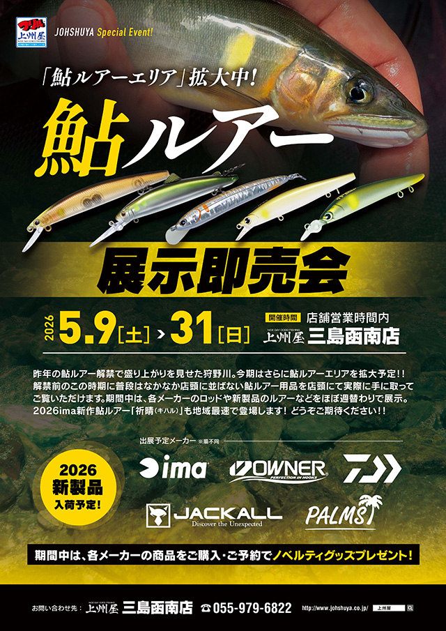 2026年5月9日(土)~31日(日)の期間中、上州屋三島函南店にてエリア拡大中!人気鮎ルアー各社“ほぼ週替わり”の展示即売会を開催します!