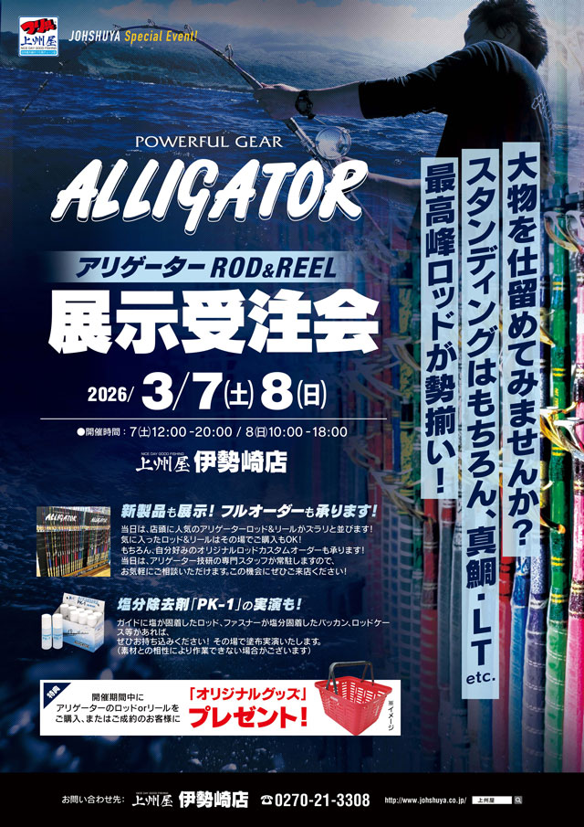 上記2日間、上州屋伊勢崎店にてグラスワンピースロッドの元祖、アリゲーターロッド&リールの展示受注会を開催します!