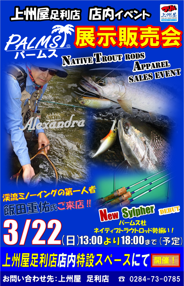 2026年3月22日(13:00~18:00、上州屋足利店に渓流ミノーイングの第一人者、飯田重祐氏が来店!パームス・ネイティブトラウト用品の展示販売会を開催します!