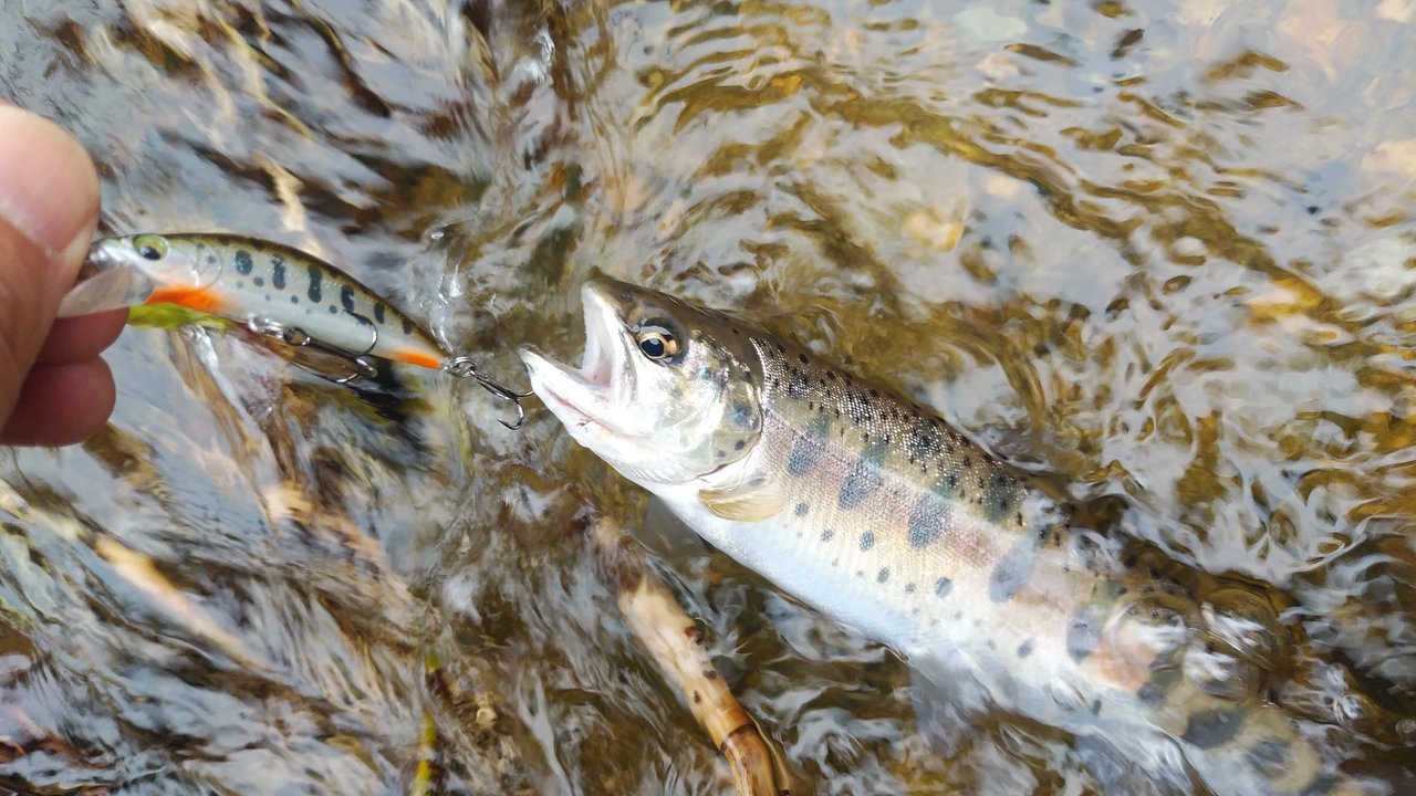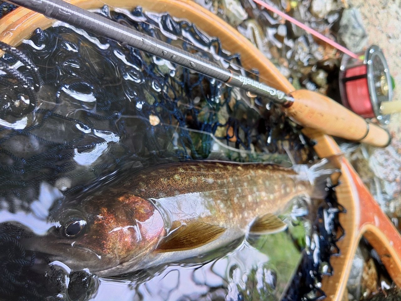 午後から五泉方面の渓流に行ってきました。水量は落ち着き、開始数等からチビイワナのチェイスがあり期待がもてそうでしたが1㎞少々を遡行してキャッチしたイワナは1尾だけと大苦戦。そこで、下流の少し開けた里川へ移動し再び遡行をすると、ヤマメを立て続けにキャッチ!どん詰まりの堰で良型イワナをついにキャッチ!!・・・しかし側面に引っ掛かったフックを外した時に反動でタモ外へポロリ…💦尺前後のイワナでしたが撮影前に逃げられました…😢曇天だったせいか当日はチャートバックやベリーといったナチュラルよりちょい派手カラーが有効でした❕