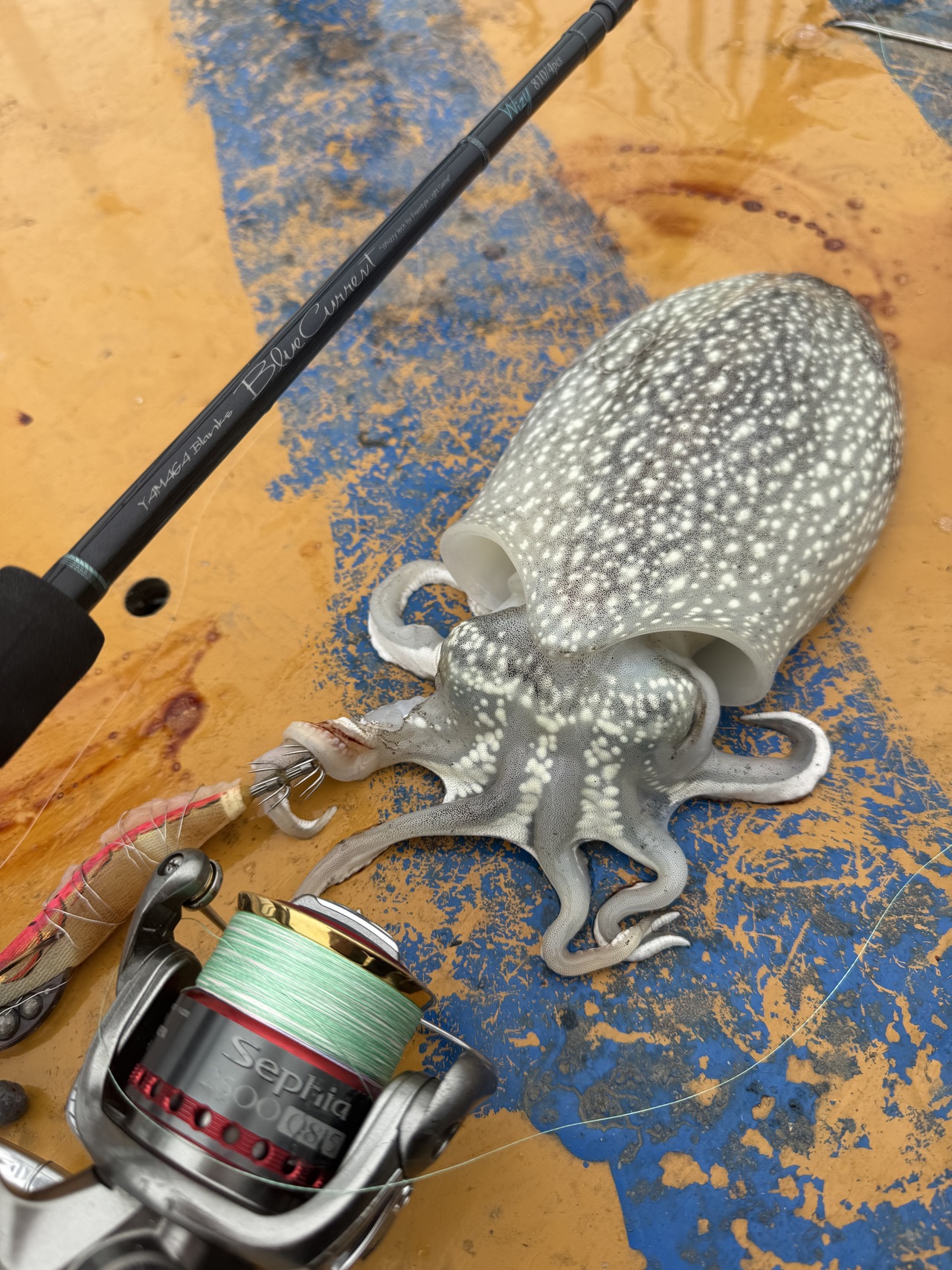 ■ロッド:SZM SQスタイルB66MS ■リール:小型両軸リール ■ライン:PE0.6号 ■仕掛け:イカメタル20号 ウキスッテ7cm
